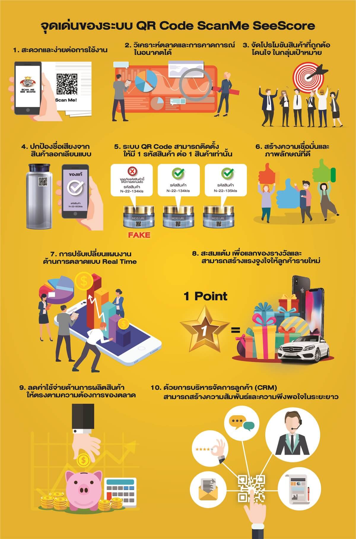 ในปัจจุบัน ภาคธุรกิจเริ่มมีการนำเทคโนโลยี QR Code เข้ามาใช้งานเพิ่มมากขึ้น ตั้งแต่การรับชำระเงินผ่าน QR Code การจัดทำสื่อแนะนำสินค้าด้วยการสแกน QR Code และด้วย ระบบ QR Code ScanMe SeeScore เป็นระบบที่เหมาะกับ เทคโนโลยีสำหรับ Big Data เป็นอย่างมาก ด้วยบริการที่หลากหลาย เช่น การเก็บข้อมูลลูกค้า, เพิ่มยอดขายให้ธุรกิจ วิเคราะห์ข้อมูลและความต้องการแบบ Real Time, ขยายตลาดสู่โลกออนไลน์, ใช้เป็นสื่อประชาสัมพันธ์, ลดค่าใช้จ่ายที่ไม่จำเป็น, ตรวจสอบสินค้าเลียนแบบ และ CRM เพื่อการพัฒนาความสัมพันธ์และความพึงพอใจของลูกค้าแบบยั่งยืน และอีกหลากหลายบริการที่ไม่ได้กล่าวมาข้างต้น เพื่อช่วยตอบสนองธุรกิจของคุณให้ครบทุกกระบวนการมากที่สุด